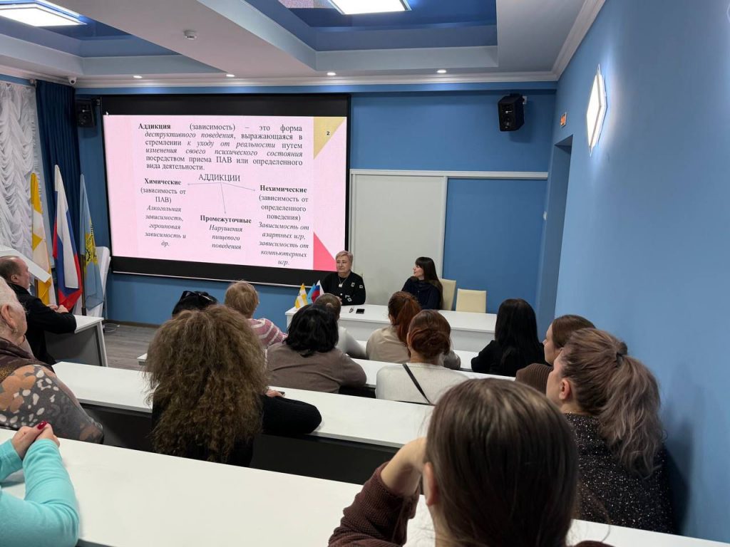 На встрече присутствовали родители и преподаватели. Тема велась в формате активного взаимодействия зала с лектором и подкреплялась комментарием директора . Врач-психиатр Николетта Клычева рассказывала о различных видах зависимостей, способах их раннего выявления, о последствиях и путях борьбы. Слушатели получили полезную информацию о проблеме наркомании, игромании, и многих других. Со слов одной из родительниц: «Узнали много нового, о чем даже не думали и не догадывались, особенно современные термины!».